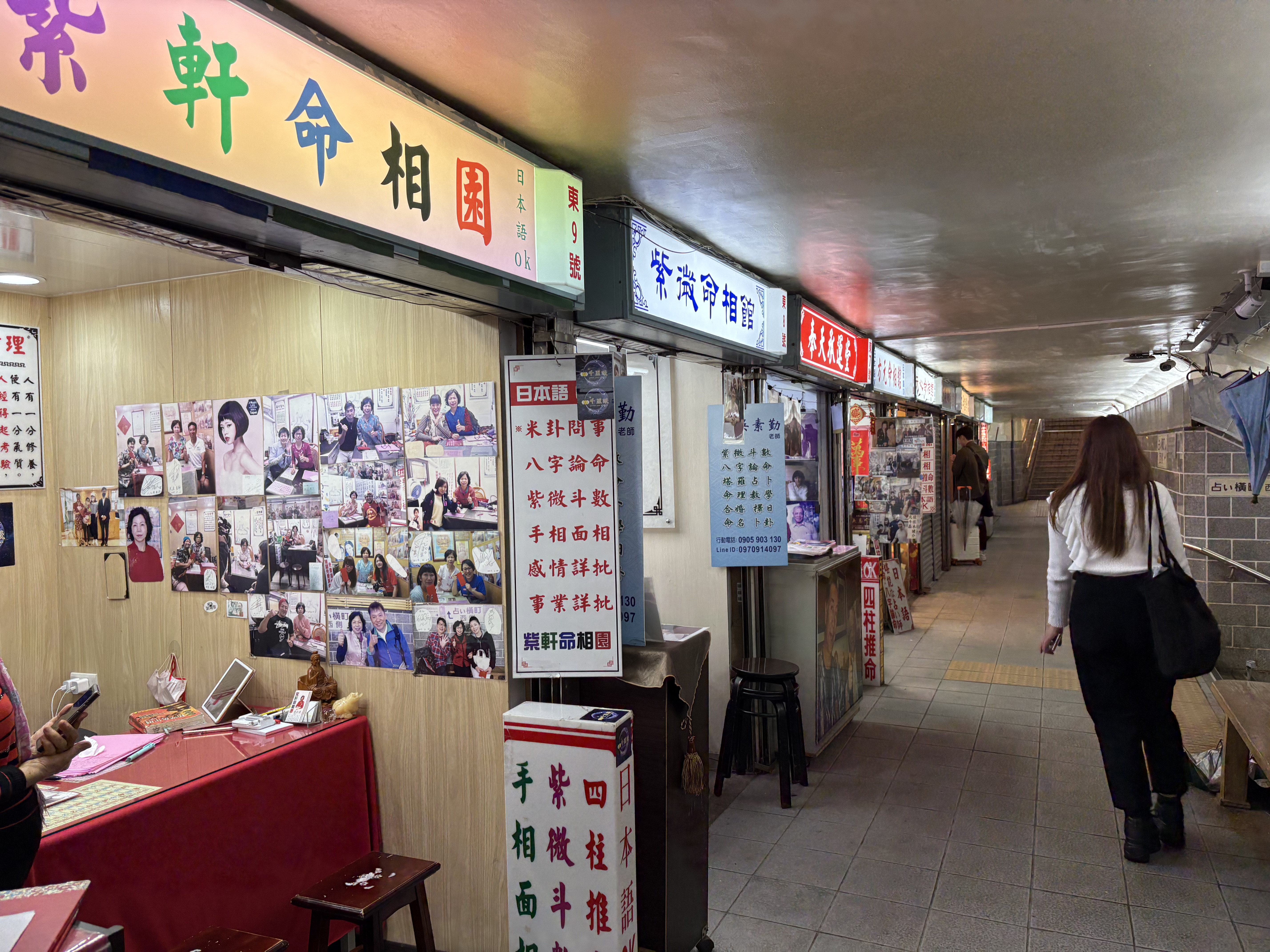 台北・行天宮の地下道に広がる占い街「命理大街」。その中でも、丁寧で的確な鑑定が評判の 「奉天承運堂」 は、四柱推命・手相・面相・米占いを使った多角的な占いが特徴の人気店です。